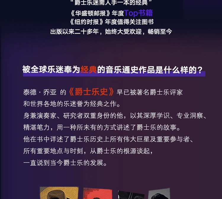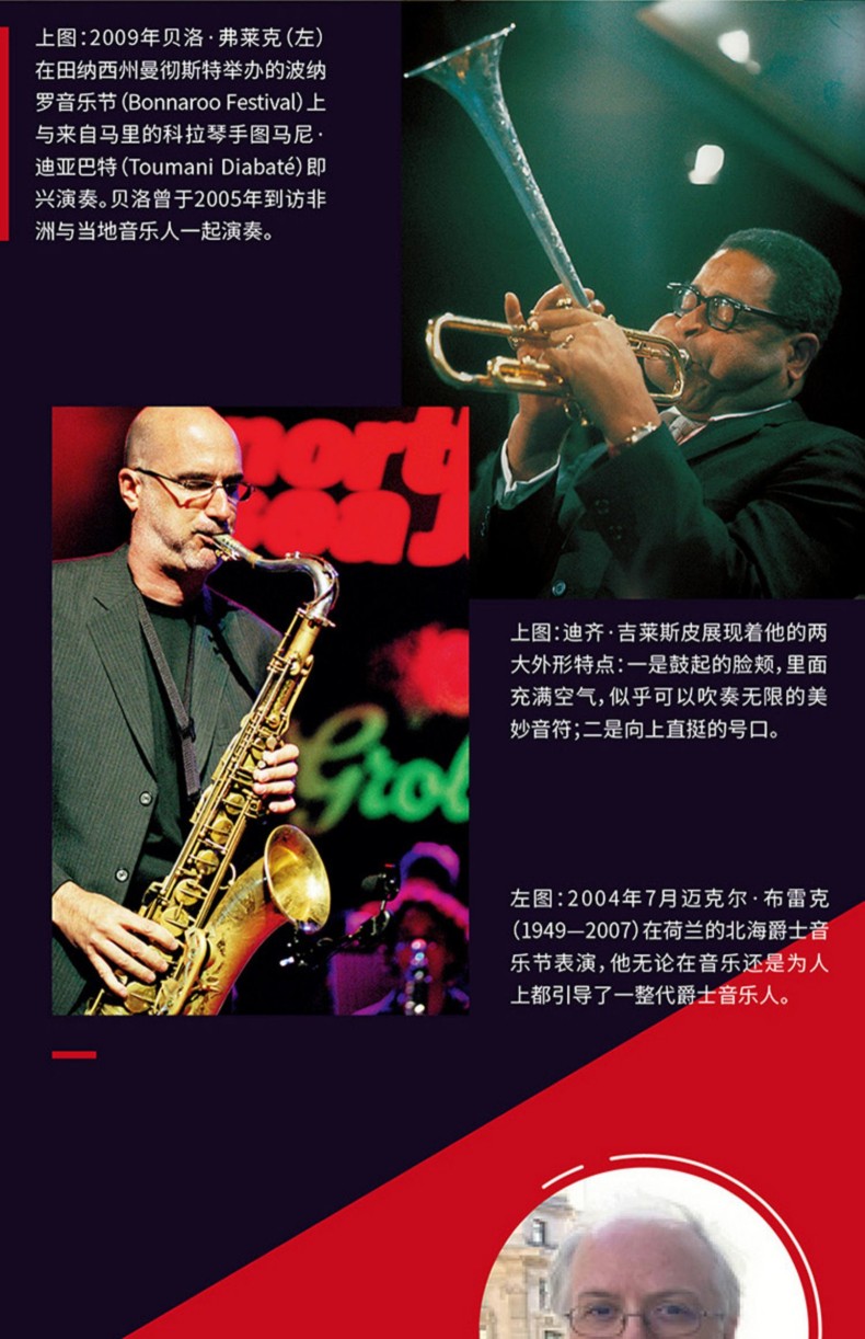 書中收錄了近350幅圖片,從專輯封面、廠牌標識、宣傳海報、曲譜手稿到音樂家、樂手、演出現場的照片,搭配翔實的文字解說,將爵士的歷史鮮活呈現。書後附有“音樂人”“音樂術語”“國際爵士音樂節推薦”“推薦聆聽”“推薦閱讀”等知識拓展內容,可謂是所有音樂愛好者的完整資源寶庫。
