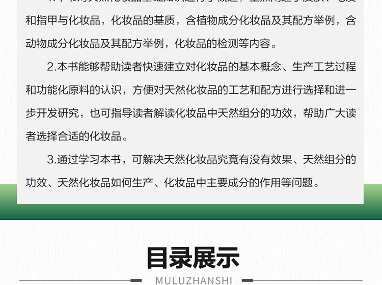 3.通過學習本書,可解決天然化妝品究竟有沒有效果、天然組分的功效、天然化妝品如何生產、化妝品中主要成分的作用等問題。
