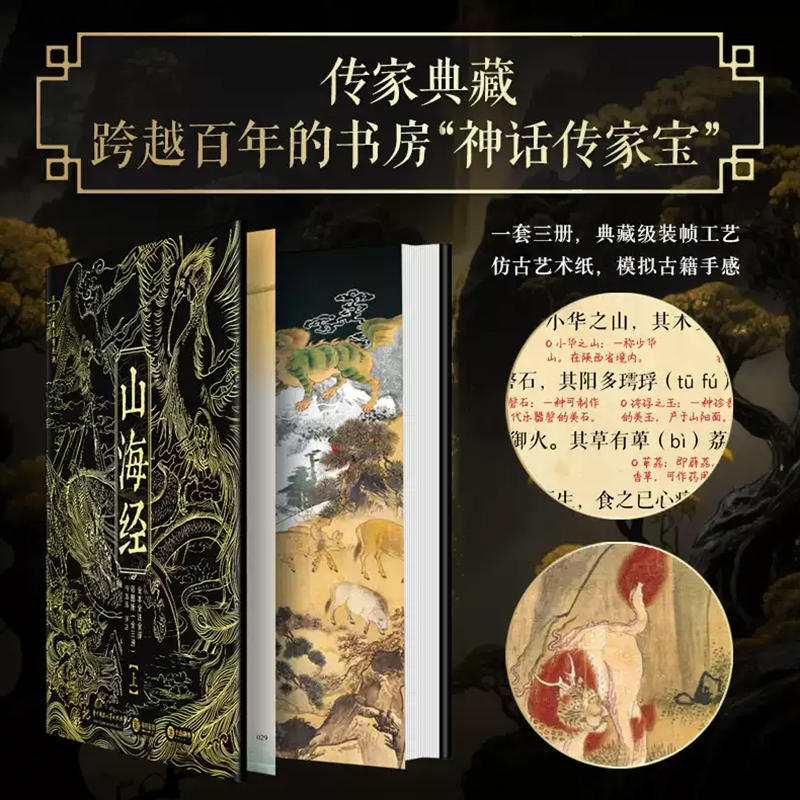 5.一套值得珍藏一輩子的《山海經》,不只書更是藝術品:滿版燙金封面設計,以高端藝術畫冊的標準打造顛覆傳統的《山海經》,一套三冊全部硬殼精裝,收藏有格調,禮贈顯品位!內頁使用仿古藝術紙,模擬古籍手感,閱讀儀式感max!隨書附贈11張《山系復原輿圖》+《華夏世系表》+32頁《神話思維導圖》,既是知識寶藏,也是藝術品級藏書!