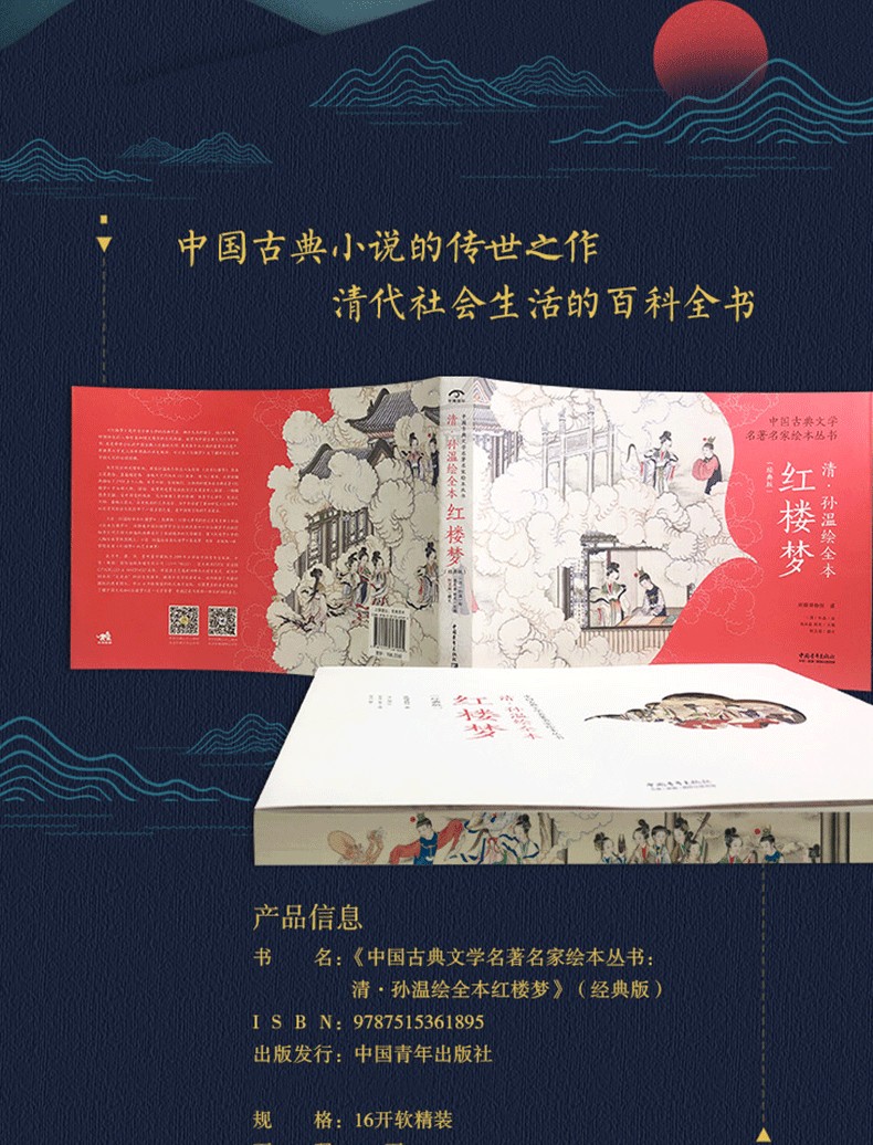 《紅樓夢》是中國古典文學的經典代表,擁有優美的語言、動人的故事、栩栩如生的人物形象和博大精深的文化內涵,被譽為中國古典文化的百科全書,也是舉世公認的中國古典小說巔峰之作,更是屬於全人類的重要文化遺產,在世界文學史上具有崇高的歷史地位,可以說《紅樓夢》是了解中國文學和中國文化的必讀經典。在清同治到光緒年間,畫家孫溫耗盡畢生心血繪成《全本紅樓夢》 絹本工筆彩繪,其篇幅宏偉,每幅尺寸約為縱43.3厘米,橫76.5厘米,全部畫幅共描繪了3700多個人物,佈景巧妙,秀麗婉約,以獨特的視角將古典名著《紅樓夢》中各種人物、活動、故事用連貫繪畫的方式呈現在世人面前。一幅幅情境交融、富有詩意的畫面,充分體現了原作精神,其情節之詳盡、筆法之工細、篇幅之宏大,具有極高的藝術造詣,為中外讀者了解和研究《紅樓夢》以及清代社會文化打開了一扇多彩之窗,是中國的藝術藏品。 《清孫溫繪全本紅樓夢》(經典版)以圖文並茂的形式完美呈現了孫溫《全本紅樓夢》,還特邀中國紅樓夢學會會長張慶善和中國紅樓夢學會執行秘書長何衛國為孫溫的畫冊進行了生動精準的文字解讀,使《紅樓夢》中的人物與故事躍然紙上。 《清孫溫繪全本紅樓夢》集名著、名家、名畫為一體,帶您走進《紅樓夢》的藝術世界!此書中、英、法、意限量珍藏版於2019 年分別由中國青年出版社、中青(英國)國際出版傳媒有限公司(CYPI PRESS)、義大利RIZZOLI 及法國CITADELLES & MAZENOD 出版,並在法蘭克福成功舉辦首發式,成為中國出版「走出去」的標誌性圖書。根據專家及讀者建議,該書保留了限量珍藏版的原有圖文,並以16開軟精裝的形式再次出版,以期更多的讀者有機會了解中國文化和《紅樓夢》這一文學巨著,並透過此書獲得一種美的閱讀感受。