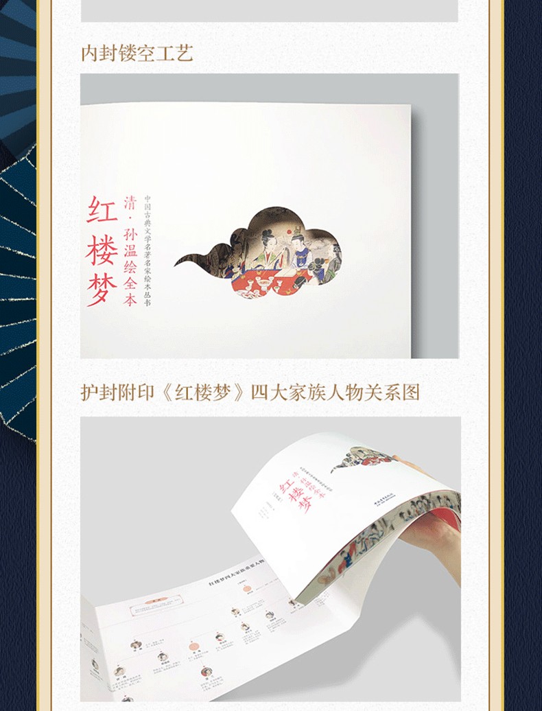本書透過230幅絹本彩繪再現《紅樓夢》的主要故事情節、人物和場景。橫開本採用裸脊鎖線裝訂,可實現180度無障礙展開閱讀,內文仿古特種紙精確還原畫作色彩和細節。同時,書特聘請中國紅樓夢學會權威專家為每幅畫面撰寫文字,圖文交相輝映,形成一部「節本」《紅樓夢》,為讀者用最短的時間閱讀中國古典名著提供了難得的素材。 2019年,中國青年出版社與全球頂尖出版商合作出版了該書的中、英、法、意四個語種的限量珍藏版,創造了《紅樓夢》首次中、英、法、意四個語種同時出版的記錄。特裝刷邊版《清.孫溫繪全本紅樓夢》(經典版)保留了限量珍藏版的原有圖文,並以16開軟精裝的形式再次出版,同時精選經典場景圖對書進行刷邊,進一步提升收藏價值,讓更多的讀者有機會了解中國文化和《紅樓夢》這一文學巨著,並透過此書獲得一種美的閱讀感受。