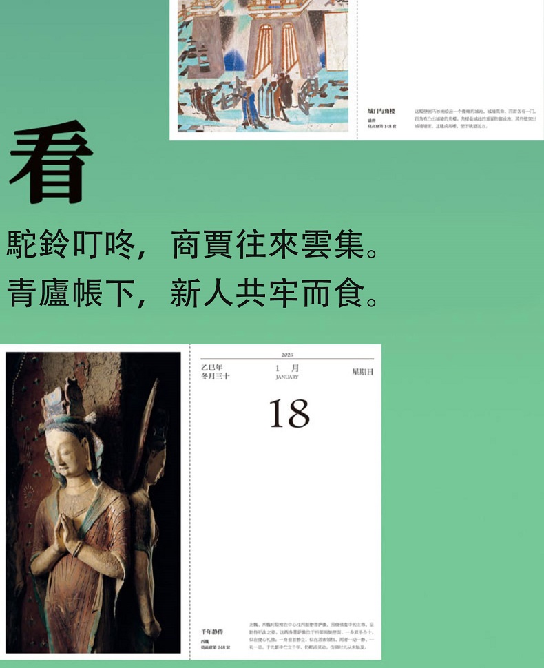 如是莫高,歲月凝光。璨然在壁,萬象奔來。敦煌研究院出品敦煌曆,2026年丙午馬年時序生輝。 甄選收錄335幅高清壁畫、30幅專家臨摹作品,特別選輯過往未公開的清晰細節。窮天下諫詭,盡人間麗飾。看天衣飛揚,滿壁風動,看琵琶弦上,落花成雨,看經變莊嚴,供養虔誠,看樂舞翩躚,法音繚繞,看菩薩低眉,金剛怒目,天女散花,力士擎天。 除夕日,莫高窟31窟《多寶塔》,聽塔鈴清響,新歲將至,圓滿遞增。 正月初一,莫高窟144窟《日天》,赤輪高懸,白馬踏春,日神乘坐五馬寶座,五駿馳騁,踏開一年新歲。 2 正月初五,榆林窟15窟《吐蕃財神》,瓔珞掛身,寶雨盈庭。 寒衣節,莫高窟202窟《樹上生衣》,願寒衣化暖,歲月生春。 冬至日,莫高窟156窟《舞樂圖》,瑞雪護佑,照破歲寒。 …… 既有佛國淨土,也繪人間百相。駝鈴叮咚,商賈往來雲集;青廬帳下,新人共牢而食;庖廚騰香,樂舞催宴;獵騎如風,羽箭穿雲;百戲雜陳,萬......