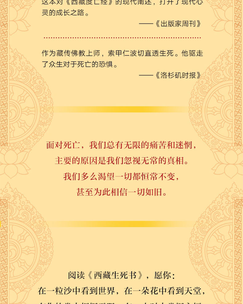 《西藏生死書:一日一課》是《西藏生死書》的精華普及本。索甲仁波切從《西藏生死書》精選365段靈性文字,一天一篇,隨春花、夏風、秋葉、冬陽一起感受心靈的寧靜與平和。一年365日,修行365頁。引導讀者感悟智慧,擺脫煩惱,獲得內心的平靜。 《西藏生死書:一日一課》中包含了索甲仁波切對佛法的領悟、修行的指導,給人充沛的活力、廣闊的心靈和直指人心的溫暖。