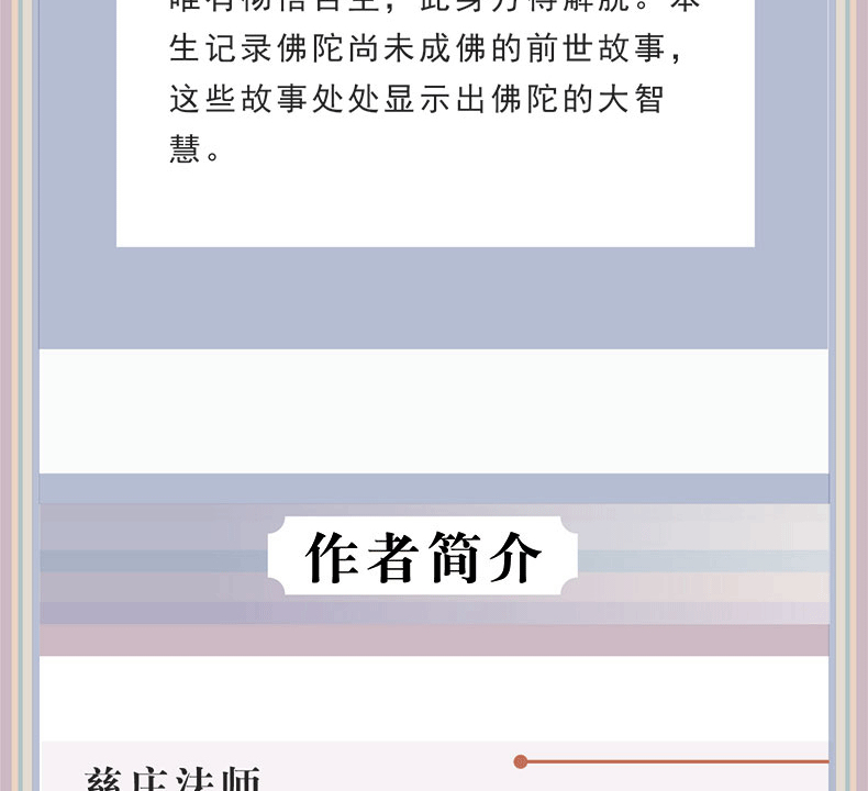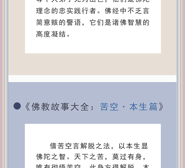 《苦空·本生篇》,藉苦空言解脫之法,以本生顯佛陀之智。天下之苦,莫過有身,唯有徹悟苦空,此身方得解脫。本生記載佛陀尚未成佛的前世故事,這些故事處處顯示出佛陀的大智慧。