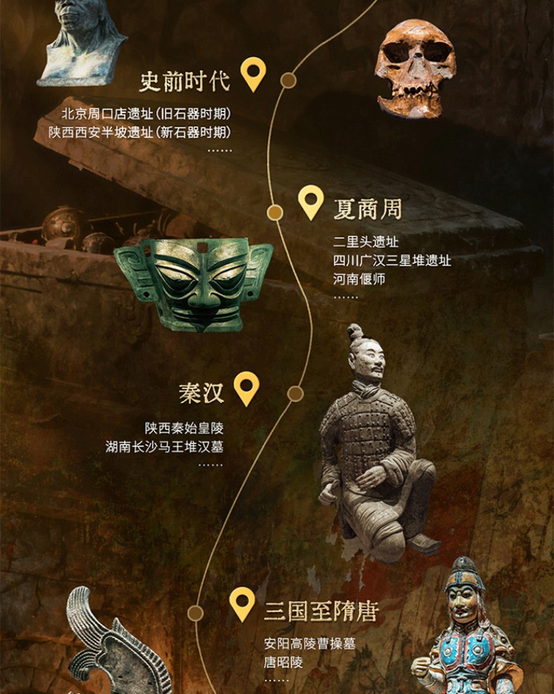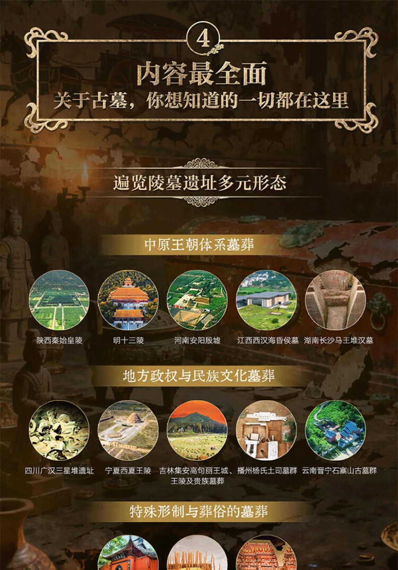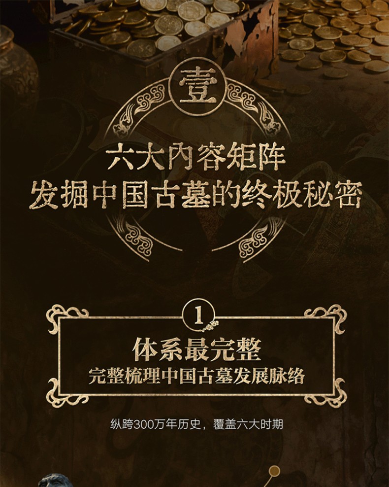 1. 縱貫3萬年中國陵墓遺址發展歷程。從舊石器時期北京周口店遺址至清西陵,包含7大歷史時期,縱貫3萬年歷史,系統講述123座陵墓遺址,清晰展現中國古墓完整發展脈絡。