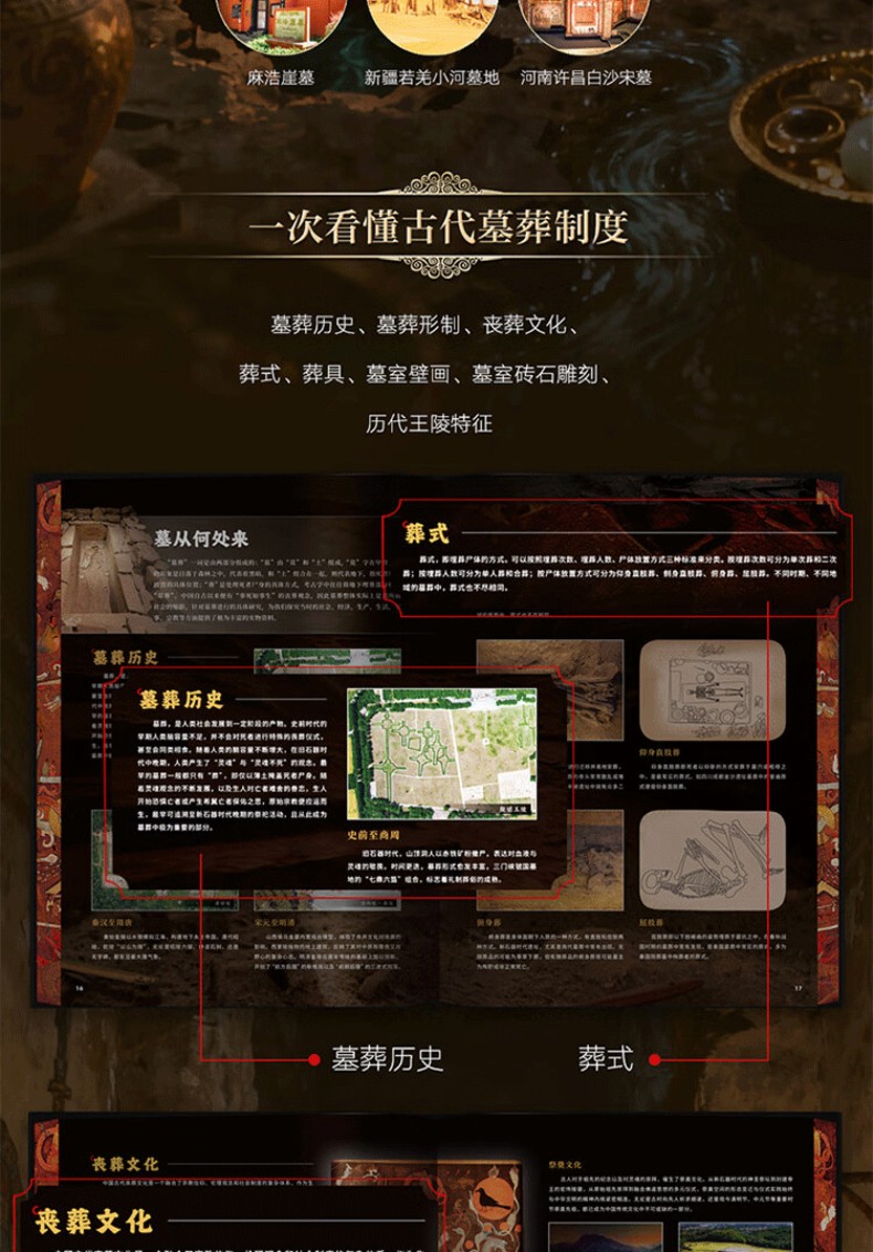 5. 50個趣味歷史文化趣味知識揭秘:對每座古墓進行文化深挖,揭秘背後的社會文化、古代政治、歷史事件、歷史人物、歷史文獻、古代建築、古代工程、古代生活、禮製文化、宗教信仰、發掘故事、考古奇事、考古成果、科學原理、未解之謎,如同一部關於中國古代社會的百科全書。
