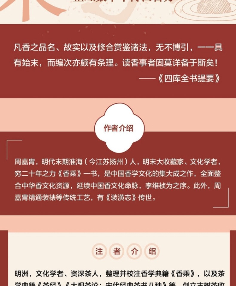《香乘》一書是明末淮海(今江蘇揚州)學者、香學家周嘉冑窮二十年之力蒐集整理的香學著作,也是中國香文化集大成的經典之作。周嘉冑此書囊括了各種香材的辨析、產地、特等香學知識;蒐集整理了大量與中國香文化有關的典故趣事,可謂知識和趣味兼備,是了解中國香文化的之作。更彌足珍貴的是,在《香乘》還博採宋代以來諸香譜之長,整理了很多傳世香方,這些香方在今天不僅具有香學上的史料價值,也是香道愛好者可以不斷發掘實踐的寶庫和源泉。
